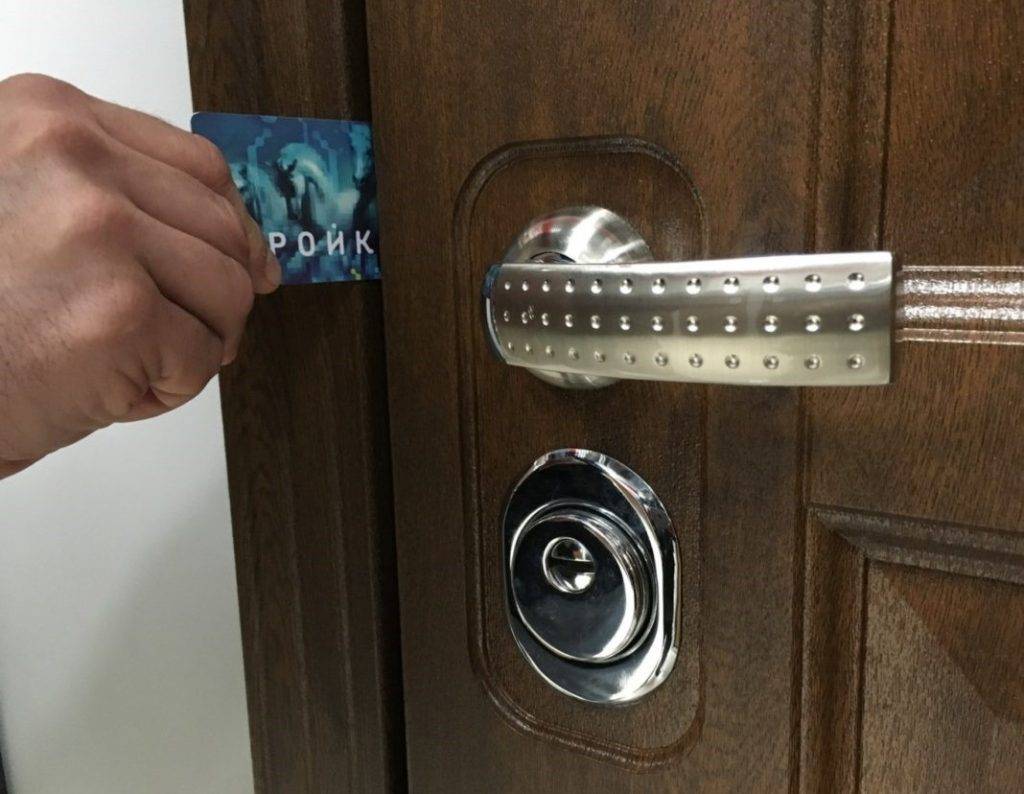 - Если ключ провернулся, но дверь все равно не открывается, то, скорее всего, дело в язычке. Когда застрял этот элемент, то вы можете смело использовать пластиковую карту, линейку или нож. Карта вставляется в щель между полотном и коробом так, чтобы пластик скользил по скосу язычка. Защелка вдавливается в дверь, с помощью карты, и в этот момент ручка опускается вниз и дверь открывается. Если поломался изнутри замок межкомнатной двери, то вам на помощь придут те же инструменты. Таким способом можно самому взломать заевший замок без повреждений.