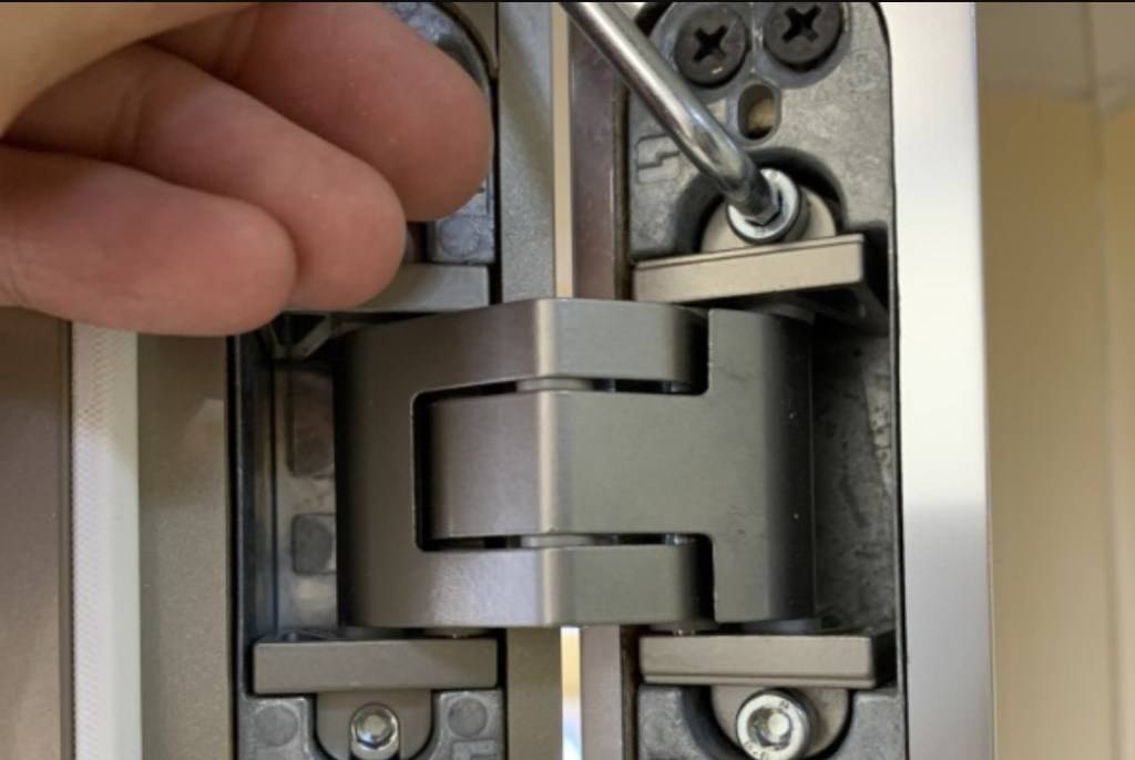 - На петле внизу с другой стороны двери выполняем приподнимание створки при помощи регулировки винтов.