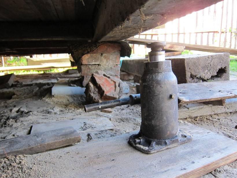 Наиболее простой и доступный широким массам способ поднятия коробки – домкрат. Так, для этой цели подойдет специальный автокран с подходящей длины стрелой или домкрат. Первый вариант подходит для недавно возведенных построек.