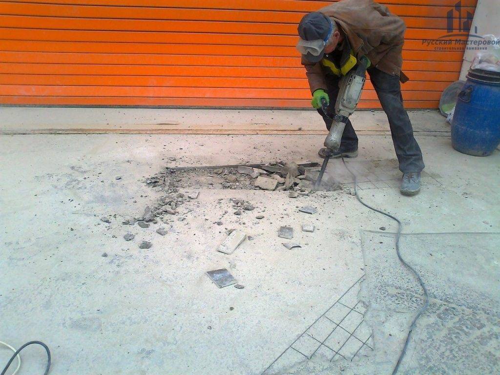 Выбрасывать его не стоит, т. к. этот элемент будет задействован на своем месте. Для следующего шага необходим отбойный молоток или мощный перфоратор. Потребуется сбить часть бетонного порога. После достижения требуемого уровня нижняя часть рамы ворот приваривается на свое место и горизонтальные распорки убираются. Можно приступить к заливке порога цементным раствором.