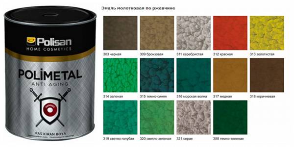 «Полиметалл» производителя Polisan. Турецкий аналог «Хаммерайта», который отличается оптимальным сочетанием цены и качества. Производитель предлагает богатую палитру цветов. Есть и недостаток — с краской сложно работать. Наносить ее лучше краскопультом.