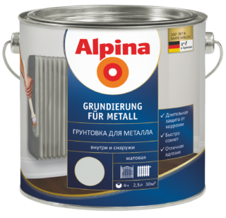 - «Alpina Direkt auf Rost» можно наносить на ржавчину. Должна полностью затвердеть, чтобы покрывать второй раз. Цвет — белый, черный и серебряный;
