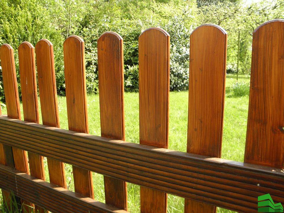 - деревянный штакетник: недорогое ограждение, способное прослужить 7-10 лет; украшенный пропилами по всей длине планок или только по верху, покрытый краской или морилкой под ценные породы древесины, он выглядит достаточно солидно и добротно