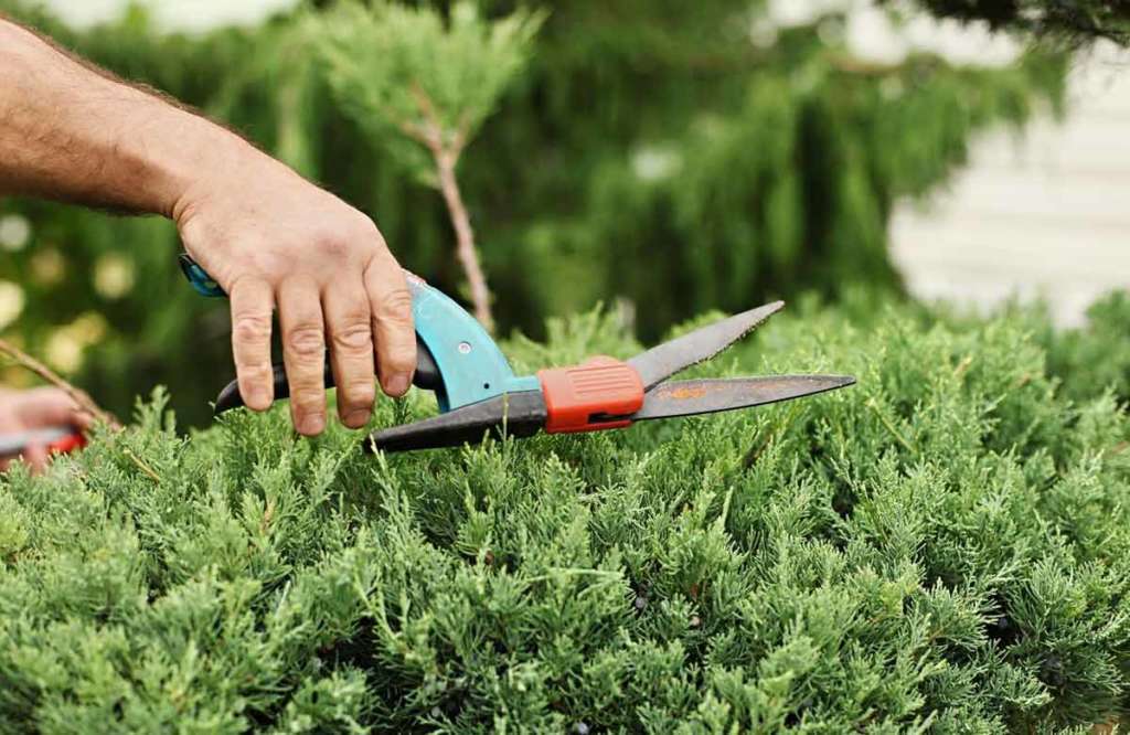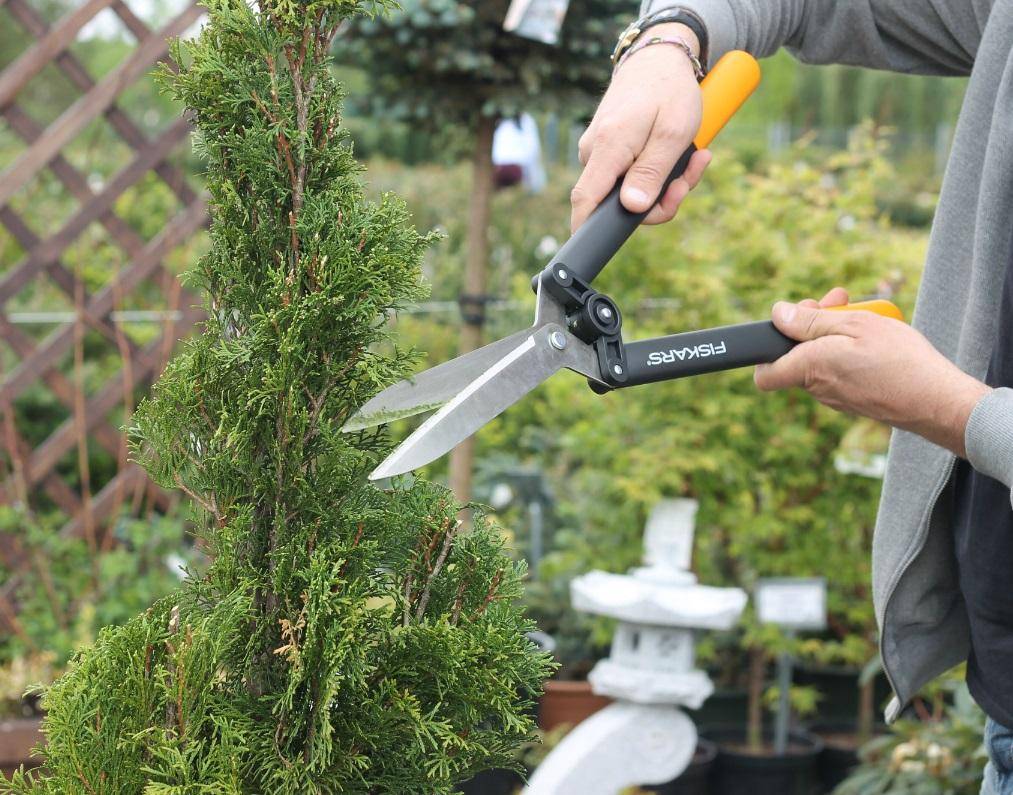 Небольшая толщина и гибкость габитуса при обрезке не создают препятствий для лезвий секатора — главное, чтобы инструмент был заточен, иначе легко травмировать дерево. Длина ручек садовых ножниц дотянется до любой высоты, серпу поддастся древесина крупных веток. Смола хвойных может вызвать аллергию и плохо отмывается с кожи, поэтому используйте рабочие перчатки и защитную одежду. Если вы являетесь владельцем обширных туевых насаждений или задумали несколько замысловатых фигур из кустарников, стоит серьёзней подготовиться к их обрезке.