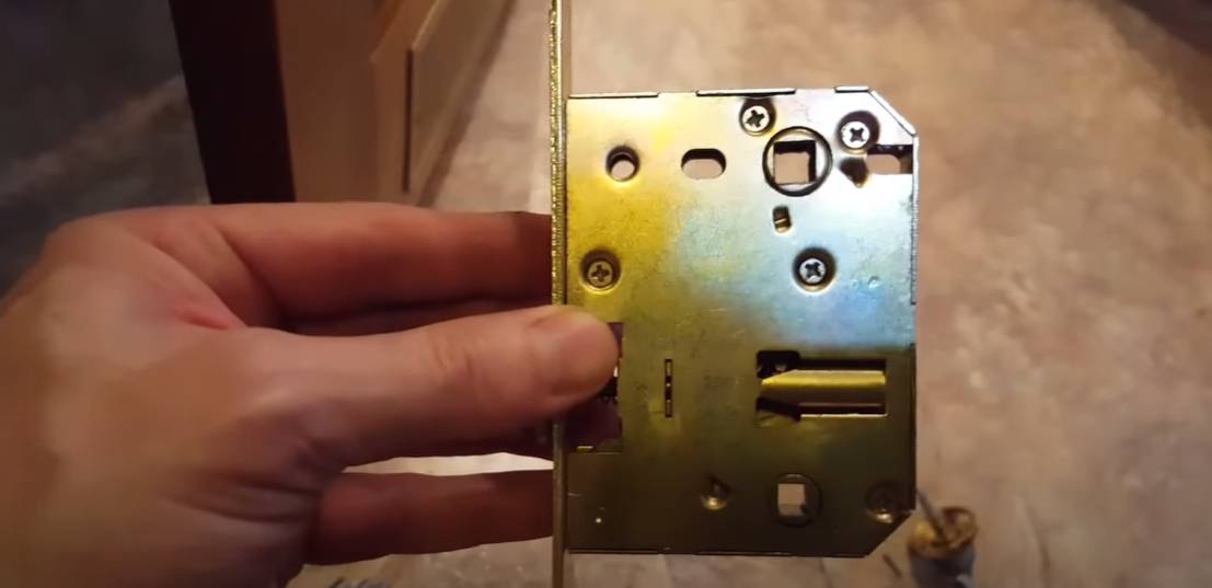 - Извлекают замок совместно с язычком, который слегка подталкивают внутрь. Вытаскивают механизм через отверстие.