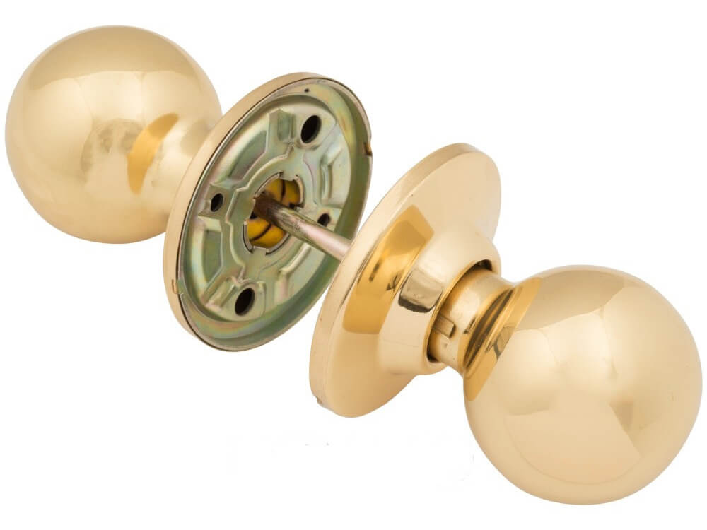 - Шарообразная ручка (второе название – ручка-кноб) имеет круглую форму, скважина врезана в центр. Благодаря этому можно запирать дверь изнутри (как на встроенный замок, так и на ключ). Как только вы повернули ключ в замочной скважине, рычаг, открывающий дверь, приходит в действие. Ручки с таким механизмом реже встречаются на межкомнатных дверях: чаще в санузлах и отелях.