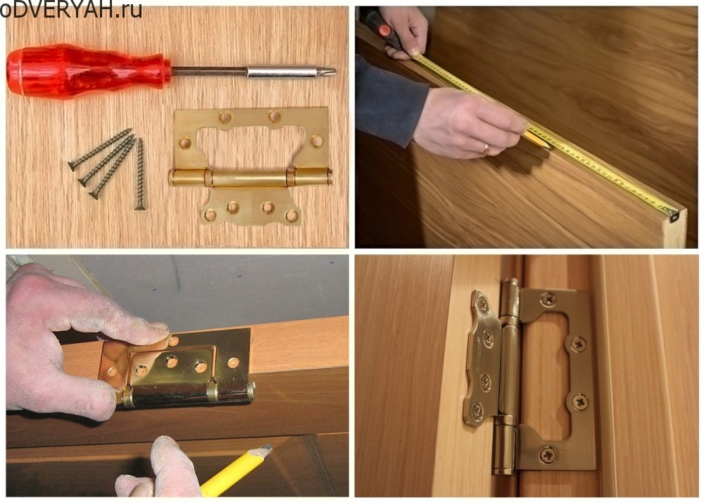 - Прикрепить части петель саморезами к коробке и полотну. Для крепежа лучше выбирать закаленные шурупы по дереву черного цвета.