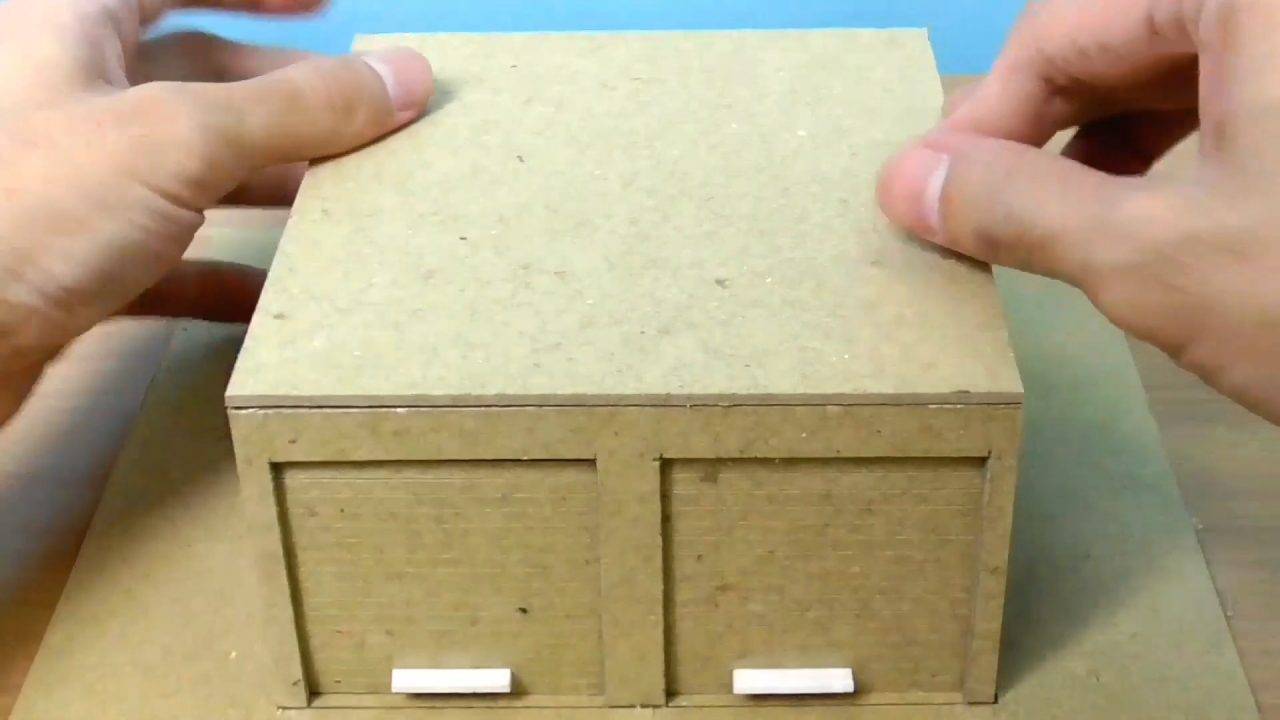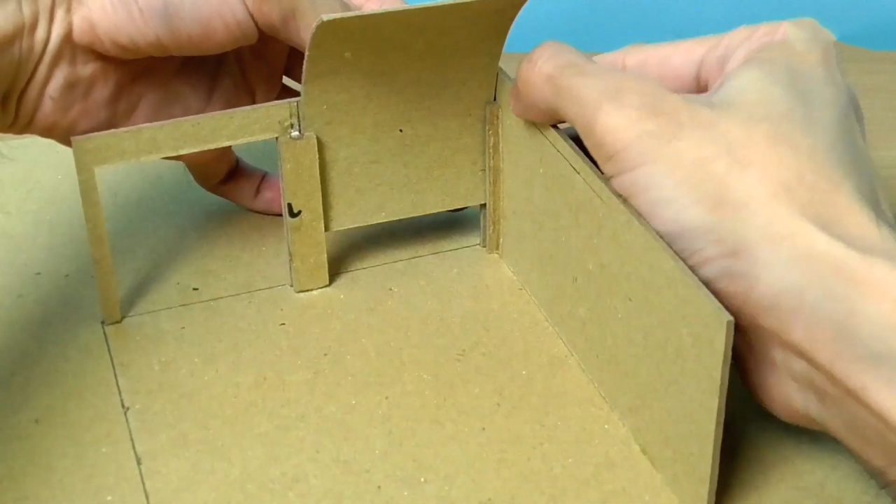 Аккуратно накрываем конструкцию крышей и закрепляем ее клеем. В нижней части ворот приклеиваем небольшие полоски картона, которые будут выполнять функцию ручек при открывании и закрывании гаража.