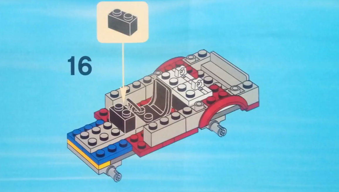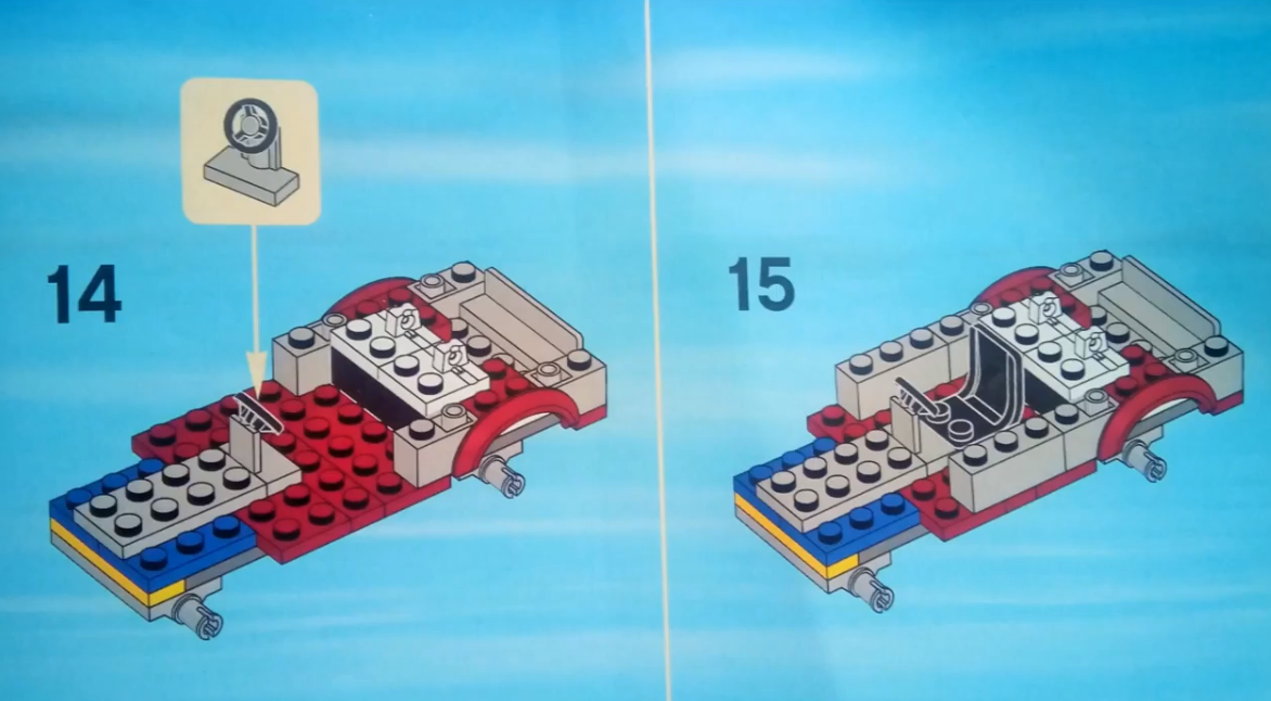 Для того чтобы сделать кабину, соедините 2 блока 1х4 по обе стороны блока 2х4, формируя подобие буквы «П» с короткими ножками. В промежутке между блоками установите руль, а затем вставьте получившуюся деталь в основание будущей машины прямо за ветровым стеклом.