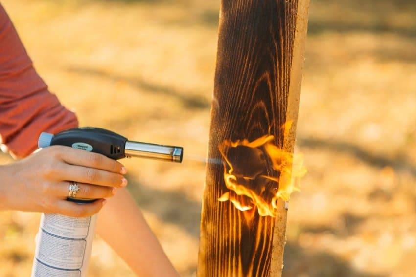 Обжиг лучше всего производить газовой горелкой для ремонта кровли. Сильно сгоревший верхний слой зачищают жесткой щеткой или керхером. Древесина при этом проявляет свою текстуру и меньше пачкается. Затем поверхности обрабатывают маслом – льняным техническим или олифой.