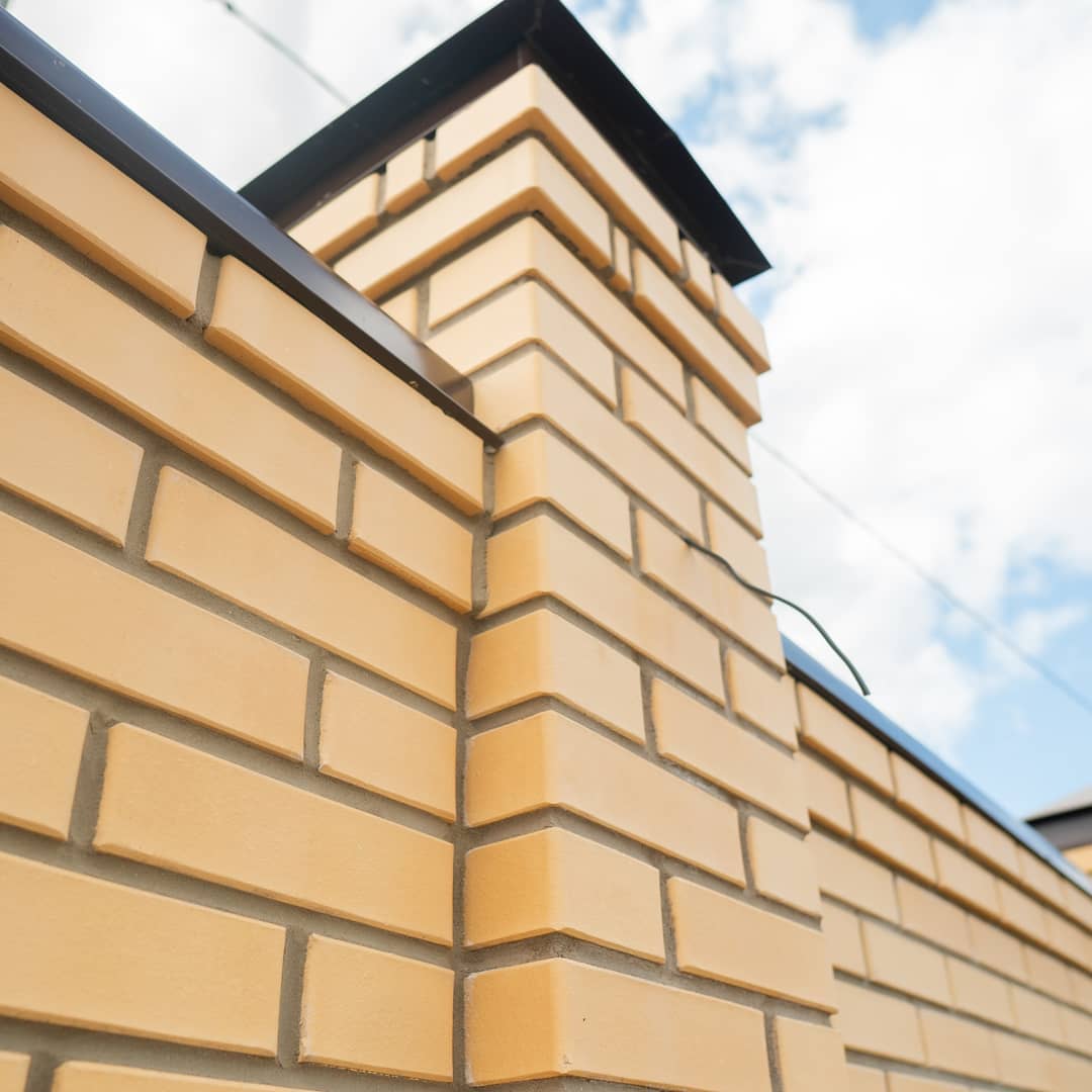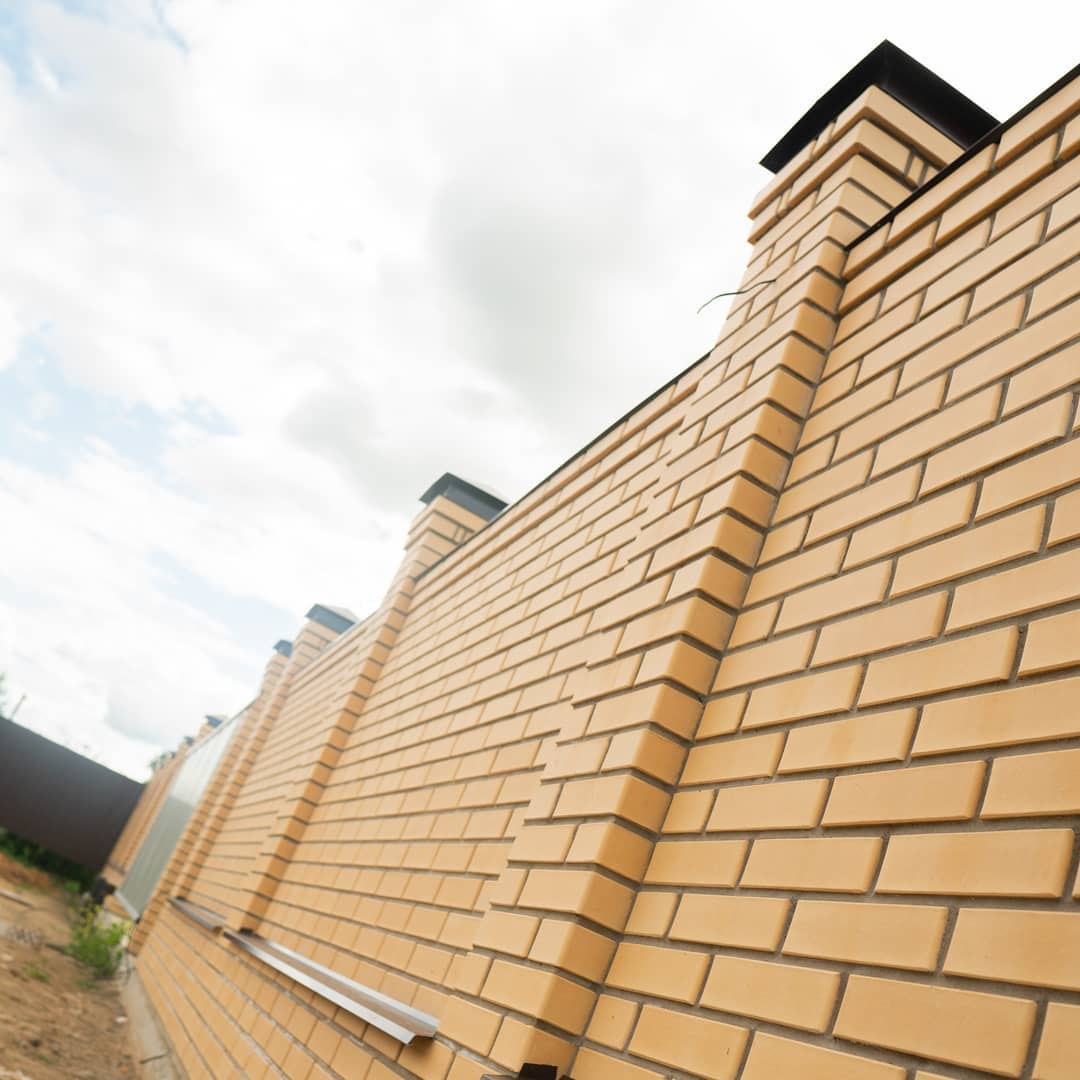 Кирпичные заборы устанавливаются на прочный ленточный фундамент и выравниваются по высоте либо повторяют изгибы рельефа. Забор может быть сплошным или комбинированным: между кирпичными столбами на аналогичной подложке крепятся секции из профлиста, досок, кованой решетки, листов поликарбоната или металлопластика.