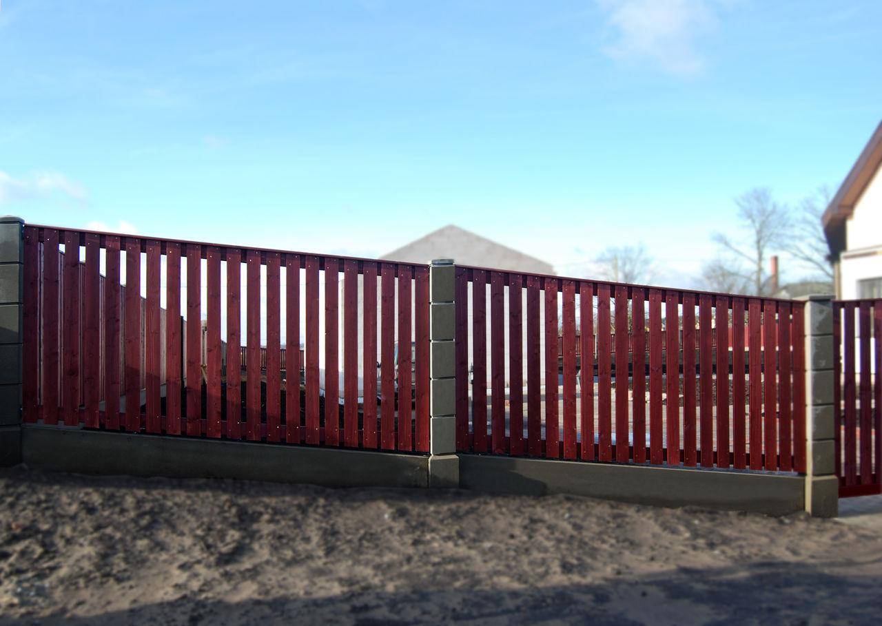 Деревянный штакетник состоит из узких досок или планок, вертикально прибитых к поперечным перекладинам. Планки легко выравниваются по высоте, при индивидуальном креплении в нижней части забора не остается больших зазоров. Легкий штакетник не требует капитального бетонного основания: поперечины крепятся к столбам с бетонной заливкой или металлическим трубам с рубероидной изоляцией. Хорош для заборов, повторяющих рельеф местности.