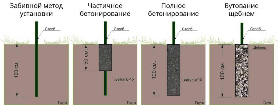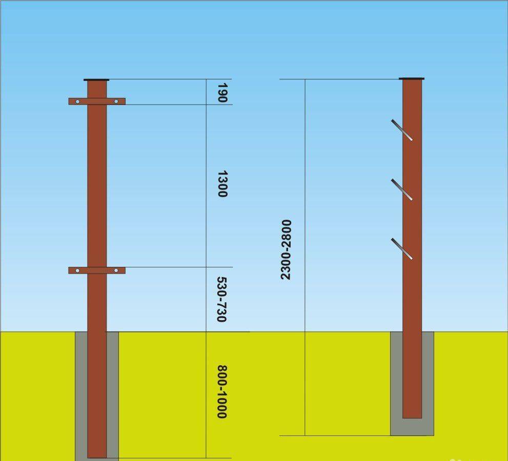Число опорных столбов и требуемых компонентов для бетонирования берется с таким учетом: один столб на шаг 2–2,5 метра, заглубление основания – от 0,9 до 1,5 м (с учетом типа грунта). Для опорных стоек выбирают профтрубы сечением 50х50 мм и размером, равным высоте ограждения, добавляя заглубление основания.