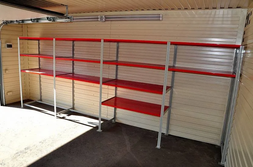 Если в гараже отсутствует возможность крепления полок на стены, тогда предусматривается применение напольных моделей с каркасом из металлопрофиля. Приблизительно ширина таких сооружений не превышает 60 см, а высота – 150-170 см. В качестве самого настила выступает материал ДСП или ЮСБ. Они очень прочные и взаимозаменяемые.