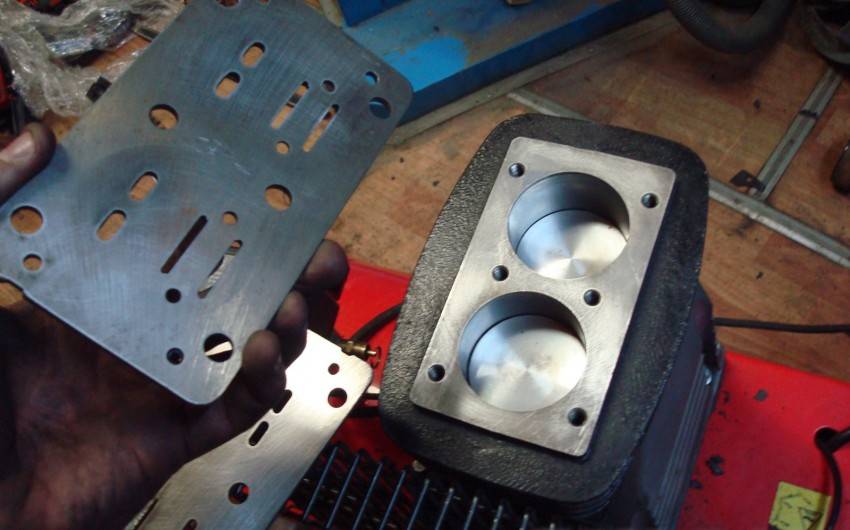 - Просверлите одно отверстие в стенке компрессора, через которое будет заливаться масло в картер. С какой стороны вы это сделаете, не имеет значения. Главное, чтобы оно располагалось ниже оси коленвала приблизительно на 10 мм. В этом отверстии нарезается резьба М8 под пробку.