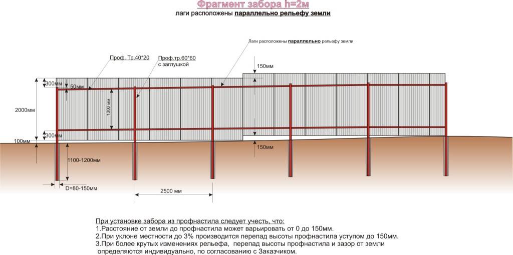 Основой забора будут столбы (стойки), при создании забора своими руками оптимальным шагом является 2-2.5 метра. Между столбами потребуются поперечные рейки — лаги, к которым и будет крепиться лист металлопрофиля. В большинстве случаев, то есть когда высота забора не превышает 2-х метров, достаточно будет двух рядов, однако чем выше, тем больше лаг необходимо.