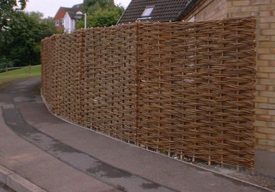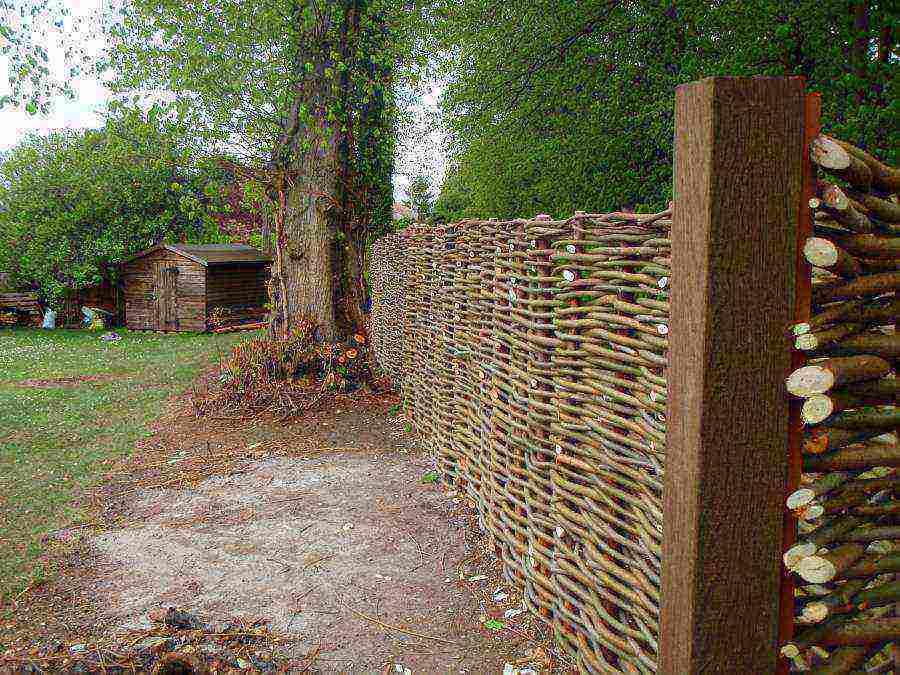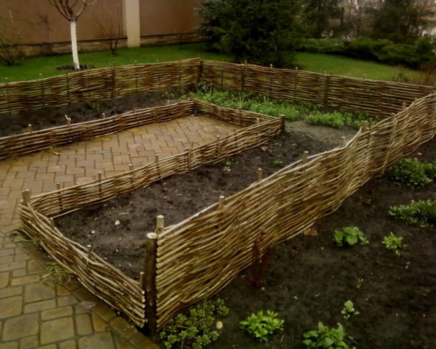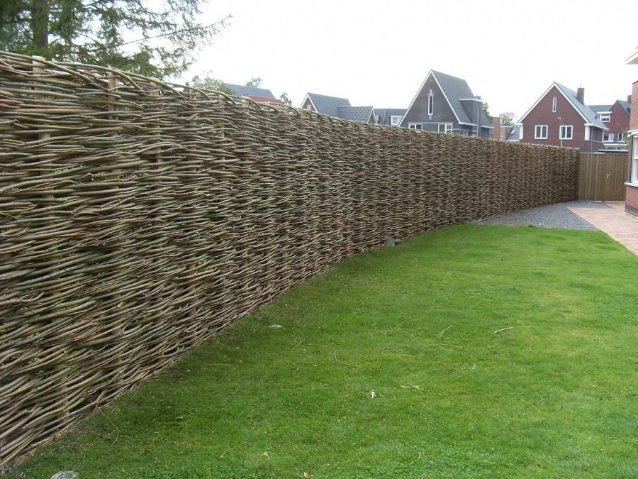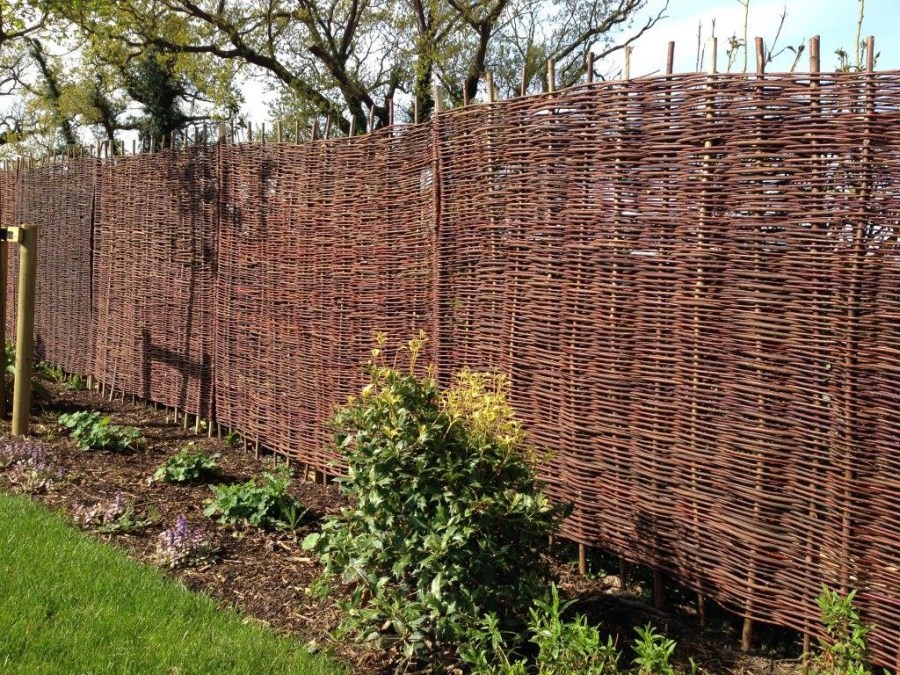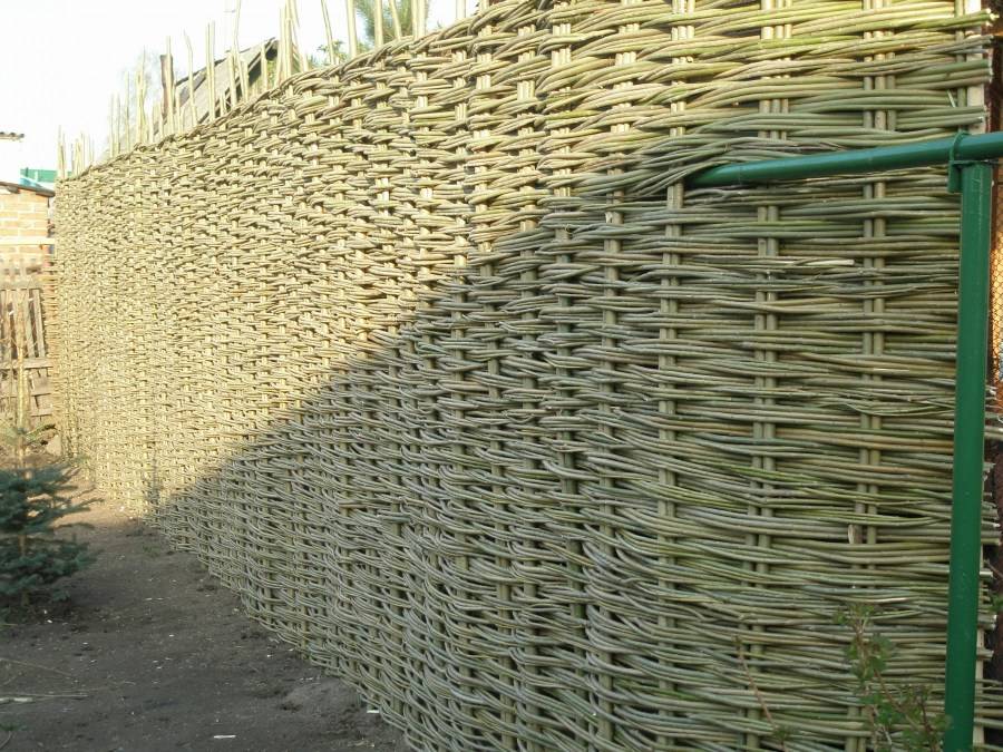 Плетеный забор используют как для огораживания всего участка, так и для выделения зон внутри него. В качестве материала используется лоза, ивовые ветви, орешник, камыш. Выбирают длинные и гибкие ветви и переплетают их, располагая параллельно друг другу. В качестве опоры и поперечной основы используют тонкие столбики, вкопанные в землю перпендикулярно ей.