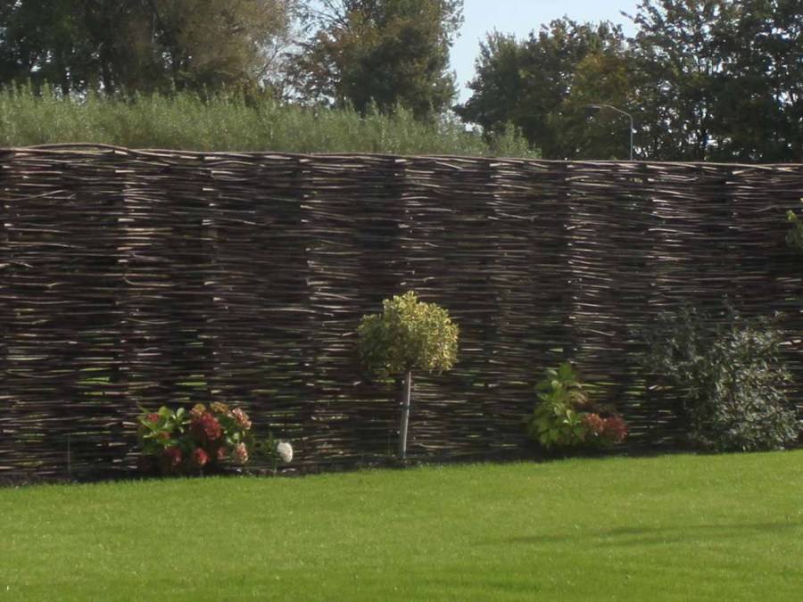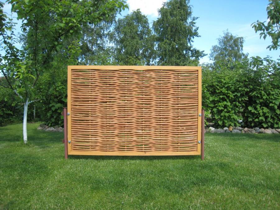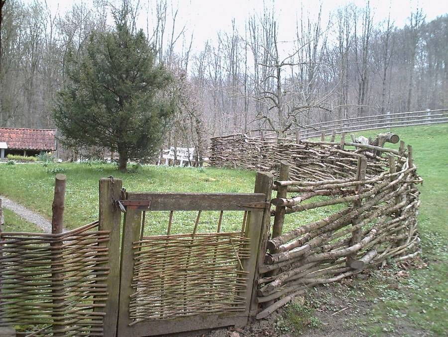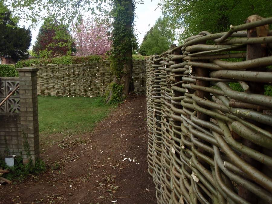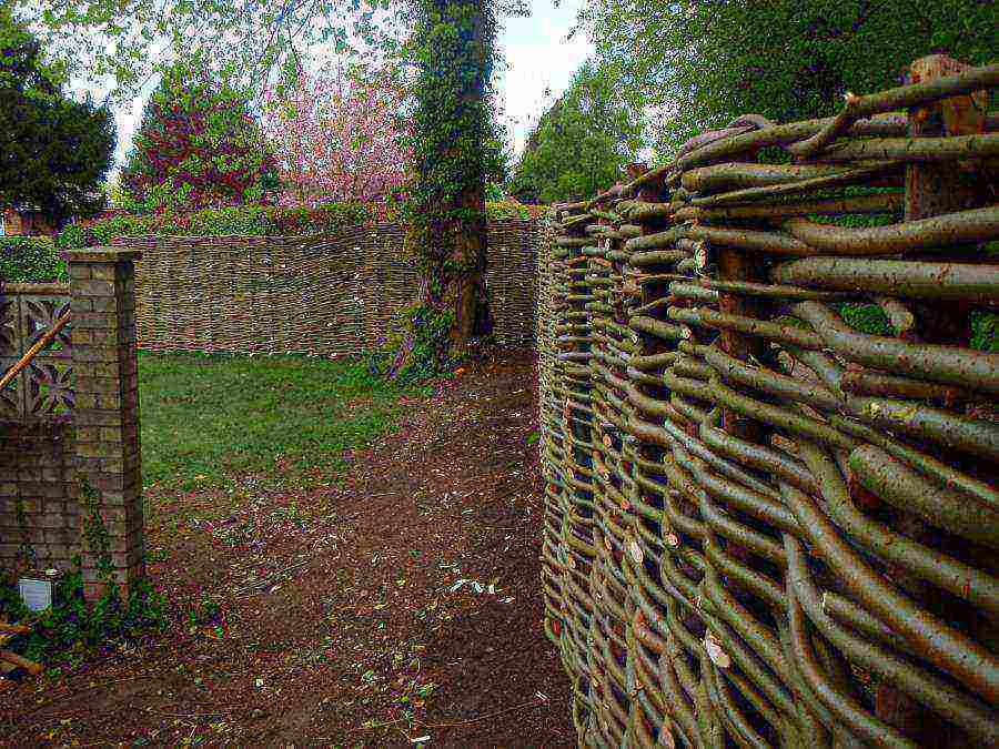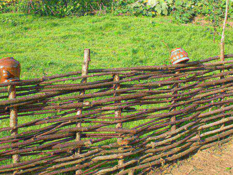 Плетеный забор используют как для огораживания всего участка, так и для выделения зон внутри него. В качестве материала используется лоза, ивовые ветви, орешник, камыш. Выбирают длинные и гибкие ветви и переплетают их, располагая параллельно друг другу. В качестве опоры и поперечной основы используют тонкие столбики, вкопанные в землю перпендикулярно ей.