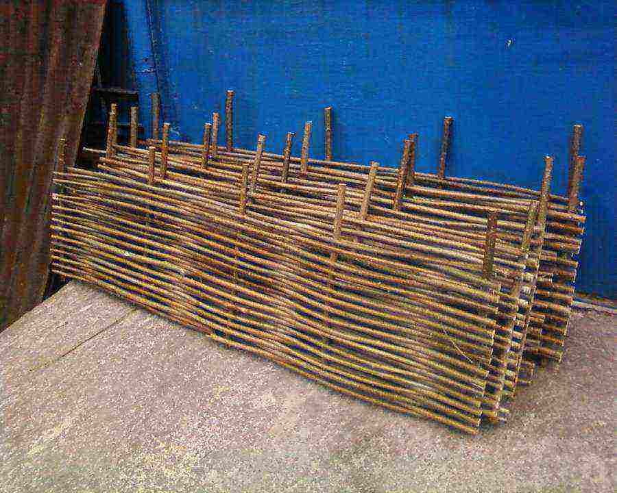 - Следующий прут устанавливается на одну опору раньше, чем закончился предыдущий, а после располагается между опорами таким же способом. Для большей прочности элементы фиксируются в местах соприкосновения с проволокой.