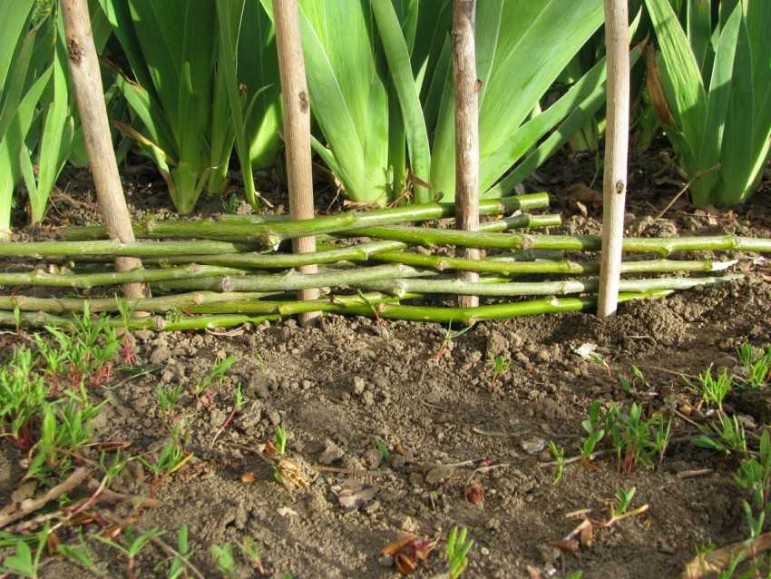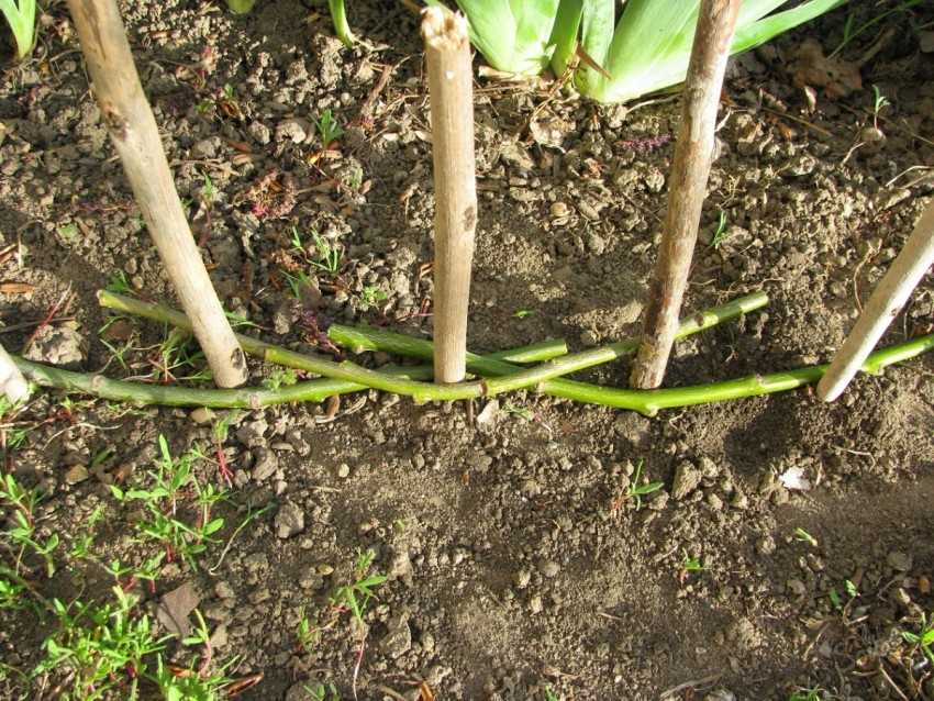 В качестве опор можно использовать толстые ветки, деревянные столбики или колышки, однако такое ограждение не прослужит долго, агрессивная среда и неблагоприятные условия быстро разрушат дерево в земле.