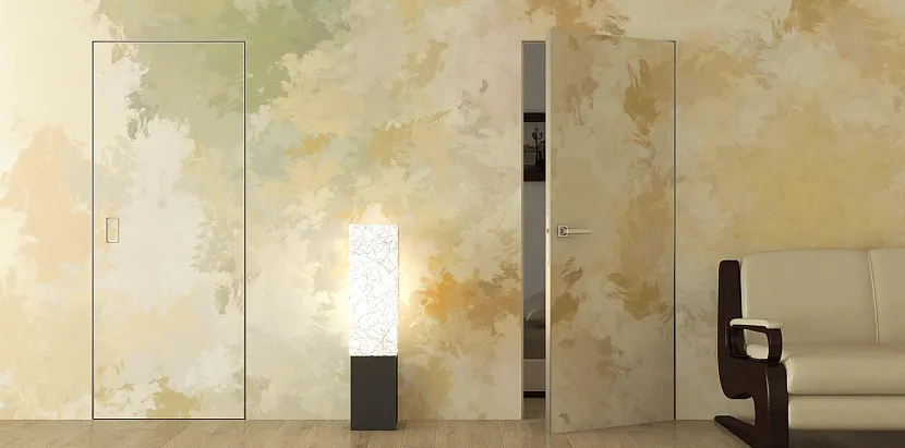 - Дверное полотно из специального материала, который можно шпаклевать, красить и даже оклеивать обоями. Называется такое полотно просто – под отделку. Кроме него, подобные двери могут изготавливаться в виде уже декорированного изделия – дело в том, что межкомнатные двери со скрытым коробом не всегда стремятся спрятать. Достаточно часто они служат большим контрастным пятном на стене – таким способом создается изюминка в помещении.