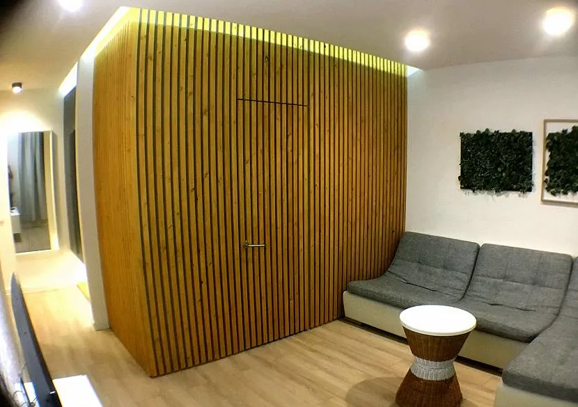 Для небольшой квартиры скрытый шкаф за дверьми-невидимками можно счесть удачной находкой. Отсутствие дверной коробки и фурнитуры образует монолитную стену, где не за что зацепиться взгляду. Закамуфлированные под стену двери визуально формируют целостность помещения, улучшая эстетическую составляющую пространства. благодаря современным технологиям крохотная восьми метровая квартира превращена в полноценно функционирующее пространство в стиле минимализм: