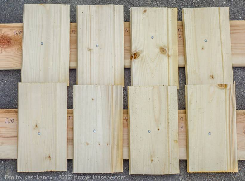 Суть: я взял 8 маленьких однотипных сосновых деревяшек, обрезков от вагонки. Первые две не красил ничем (Б/О – без обработки), просто оставил как есть. Вторую пару покрыл только пропиткой (П). Третью – только лаком (Л). Четвертую – сначала пропиткой, потом лаком (П+Л).