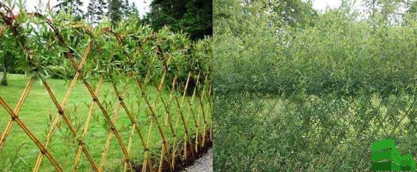 - Зеленые плетенки из ивы или лозы. Ранней весной, когда на деревнях вот-вот появятся листочки, ветки втыкают в землю, где они укореняются и образуют живую плетенку