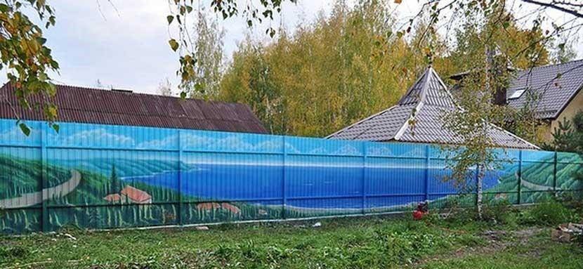 Использование красок позволит изменить серый, невзрачный цвет шифера. Кроме того, при наличии художественных навыков, можно украсить всю поверхность забора яркими и оригинальными рисунками.