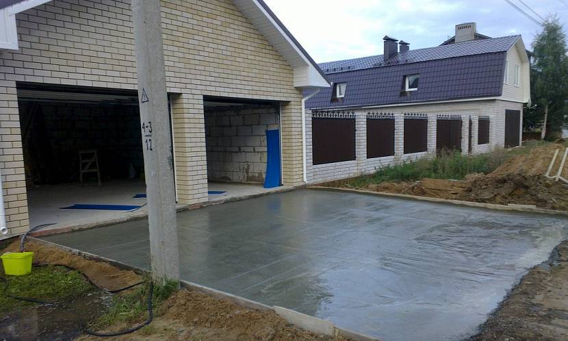 Работы по устройству бетонного пола в гараже можно проводить одновременно со строительством подъездной дороги. Это имеет смысл, поскольку используемые материалы схожи по своей природе.