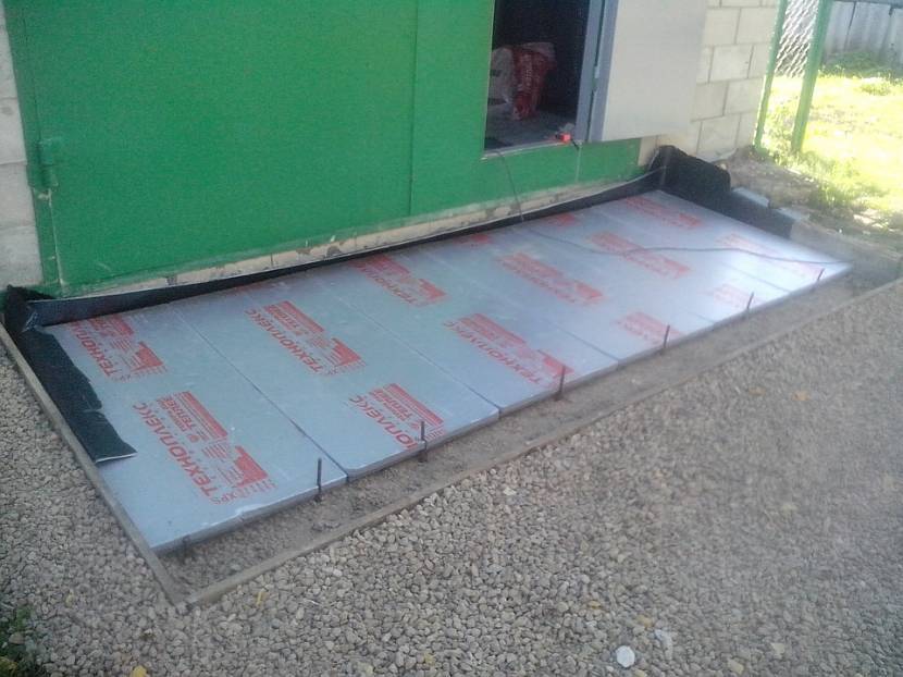 Следующую операцию можно и не проводить. Но в технологической карте она присутствует. Это утепление въезда в гараж. Для этого сегодня используют пенополистирольные плиты толщиною 5 см. Их укладывают на подготовленную подушку со смещением плит относительно друг друга ровно наполовину. После чего проводится гидроизоляция теплоизоляционного слоя с применением полимерных плёнок. И на этом подготовительный этап можно считать законченным.