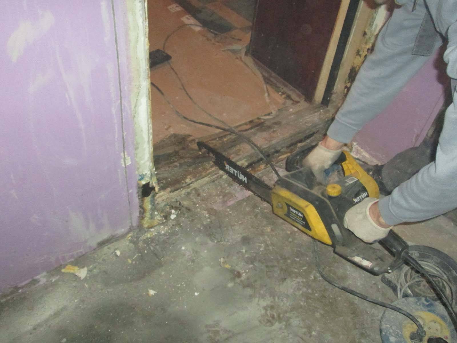 Работать нужно по кругу. Прежде всего освобождается нижняя часть короба, порог. Следующие вырезаются боковины и лишь в последнюю очередь — верхняя часть дверной коробки. Если нарушить данную последовательность и верхнюю часть короба освободить раньше других, она может просто не контролировано упасть.