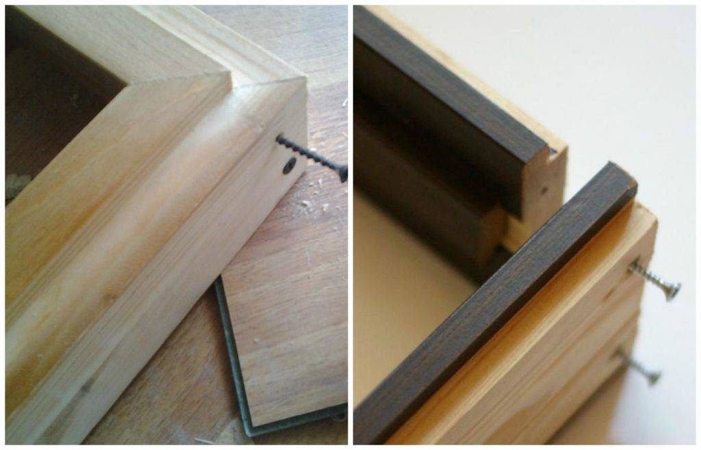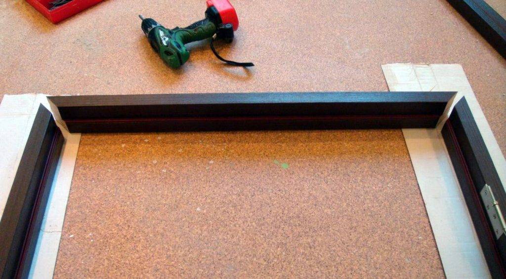 Чтобы собрать коробку в 90°, размещают готовые части будущей двери на ровной поверхности. Уголки аккуратно соединяют при помощи саморезов, вкручивая 2 самореза во все углы (под прямым углом).