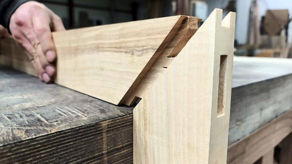 Замковое сопряжение «паз-шип». Стыковка производится при заходе выступов на торце деревянного пластикового или стального элемента в пазы ответной части на ортогональной детали.