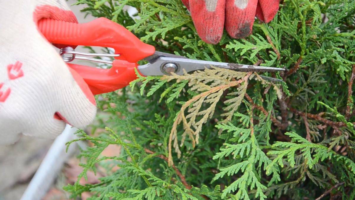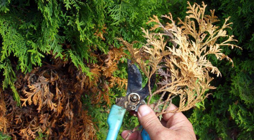 Сухие ветви у туи обрезают каждую весну, до начала вегетативного процесса