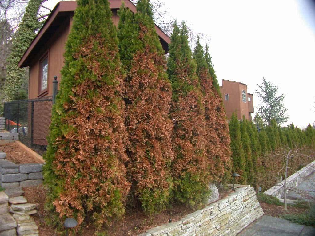 Обратите внимание, что в конце вегетативного периода многие хвойные растения (и туя в том числе) изменяют окраску: хвоя становится бурой или темной. Создается впечатление, что дерево погибло
