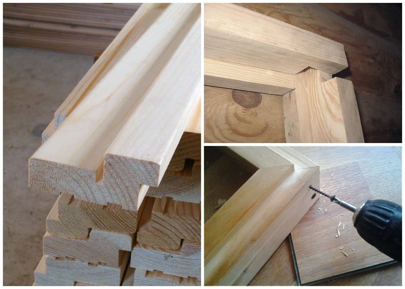 Дверная коробка состоит из нескольких брусков разного размера, которые нужно соединить вместе, предварительно подогнав и под габариты проема. Два из них более длинные – из них будут изготовлены стойки, а два – более короткие, из них сделают порог и перекладину. Размер каждого элемента будет зависеть от высоты и ширины проема, а также от способа соединения конструкции.