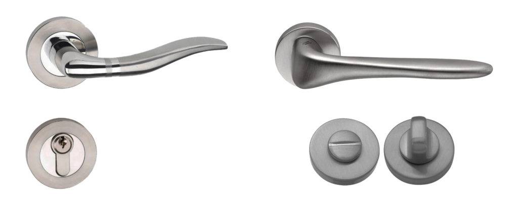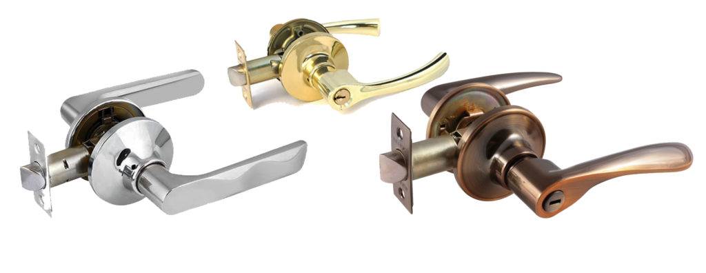 Замочные механизмы с разными блокираторами по формам и дизайну встраиваются в основную ручку (рычаги, кнопки). Можно подобрать по комплектации любую разновидность.