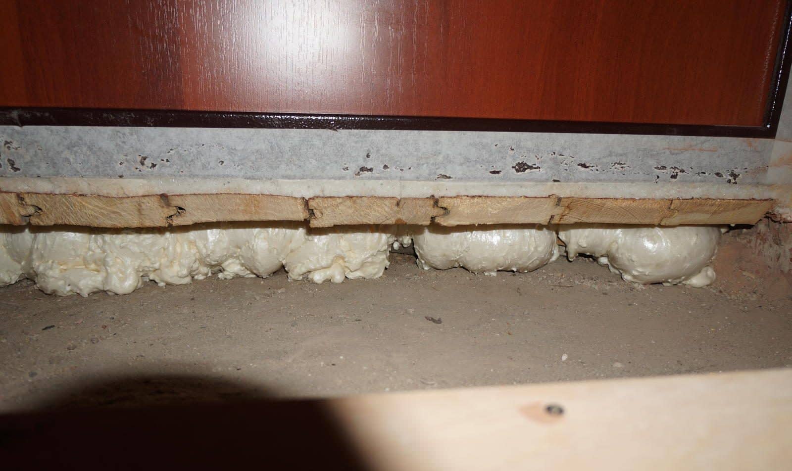 Если щель образовалась между порогом и полом, элемент демонтируется. Под него заливается напыляемый утеплитель (монтажным пистолетом). Дальше, порог возвращается на прежнее место, а излишки полимеризации убираются.