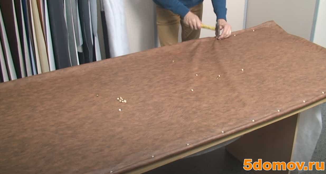 - поролон накрывается куском искусственной кожи, из ее свободных краев формируются валики, которые нужно зафиксировать мебельными гвоздями;