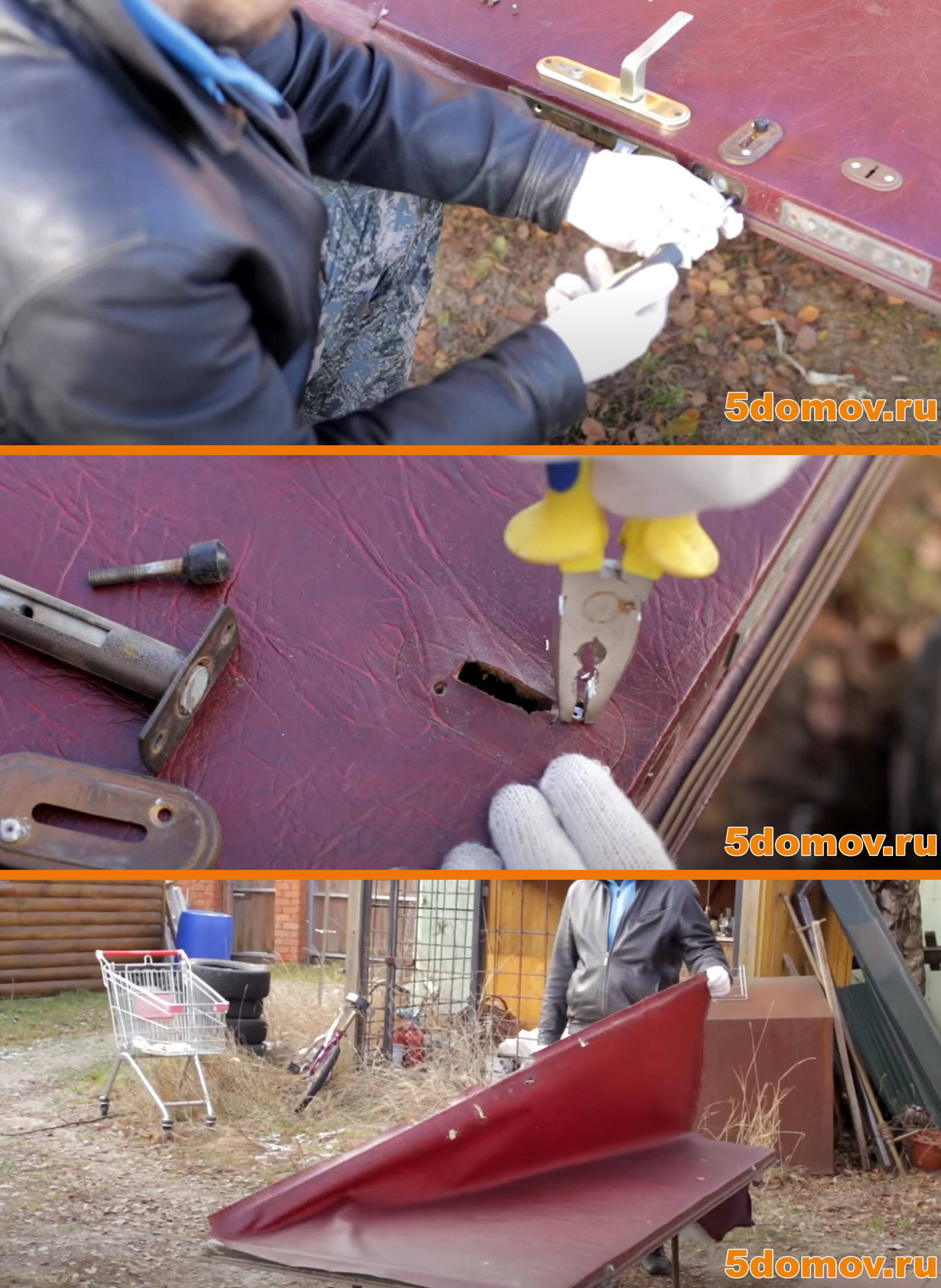 Когда дверь снята и находится вне коробки, с нее нужно демонтировать, все имеющиеся элементы. Петли, ручки, глазок, номер строения (квартиры) и замок, аккуратно откручиваются и убираются в сторону. Если дверь, имеет дополнительные посторонние элементы обшивки, то, чтобы получить доступ к внутреннему пространству полотна, их необходимо демонтировать.
