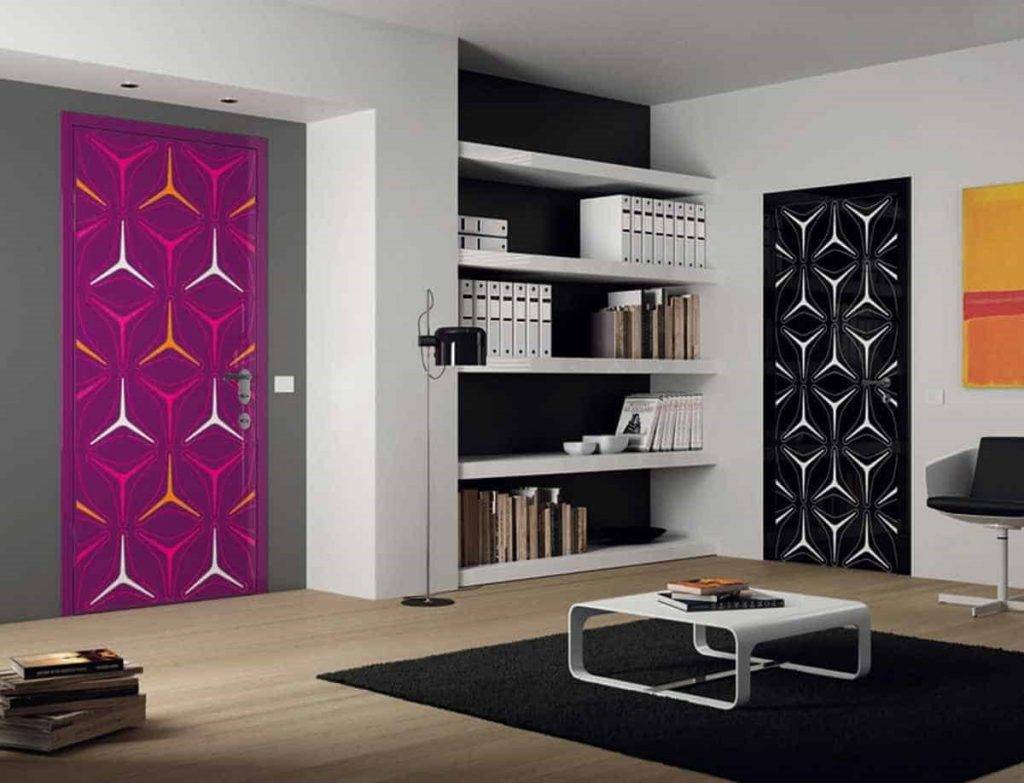 Представляют собой достаточно смелое, оригинальное и даже немного эпатажное интерьерное решение, которое заметно оживляет окружающее пространство и задает ему неповторимой характерности. Разноцветные межкомнатные модели могут сочетать даже кислотные цвета или например, бирюзовые, желтые, розовые и зеленые оттенки.