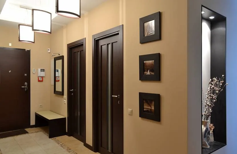 Коричневые двери и бежевый ламинат в коридоре Темный ламинат и белые двери в комнате