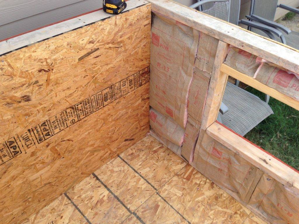 Теперь остается отделать стойки ОСБ панелями. Их крепят к каркасу саморезами, длина которых должна быть больше толщины листа на 4-5 см. Во время монтажа между плитами необходимо оставлять зазор около 3 мм — это позволит избежать деформации панелей из-за влажности или температурных перепадов.