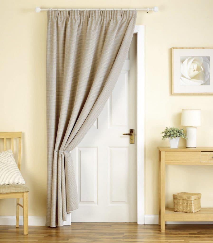 Простой, но весьма интересный вариант декорирования дверного проема с помощью штор – это взгляд в прошлое. Несколько десятилетий назад люди именно так разграничивали жилое пространство, украшая проход деревянными или тканевыми занавесками. Желаемый эффект достигался: визуально вырисовывались границы помещения, при этом не создавалось замкнутости пространства.