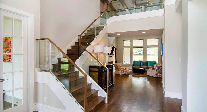 Ограждения с закаленным стеклом красивы и вдвойне безопасны – остекление служит преградой между маршем и пролетом. В каркасных моделях стекла монтируются между стойками на зажимные или пластинчатые держатели. В цельностеклянных моделях полотно устанавливается на профиль, «точки», мини-стойки. К заказу доступно прозрачное, ультра-прозрачное, бронзовое, серое стекло.