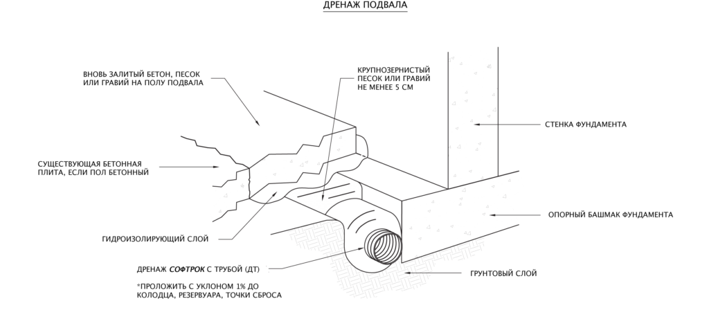 Не всегда подвал или погреб делается в местах, где грунтовые воды залегают очень глубоко. Иногда деваться некуда и приходиться выходит из сложившейся ситуации. Поэтому чтобы снизить отрицательное влияние грунтовых вод на помещение в нем сначала делают внутренний дренаж. Для этого на начальном этапе работ необходимо сделать следующее: