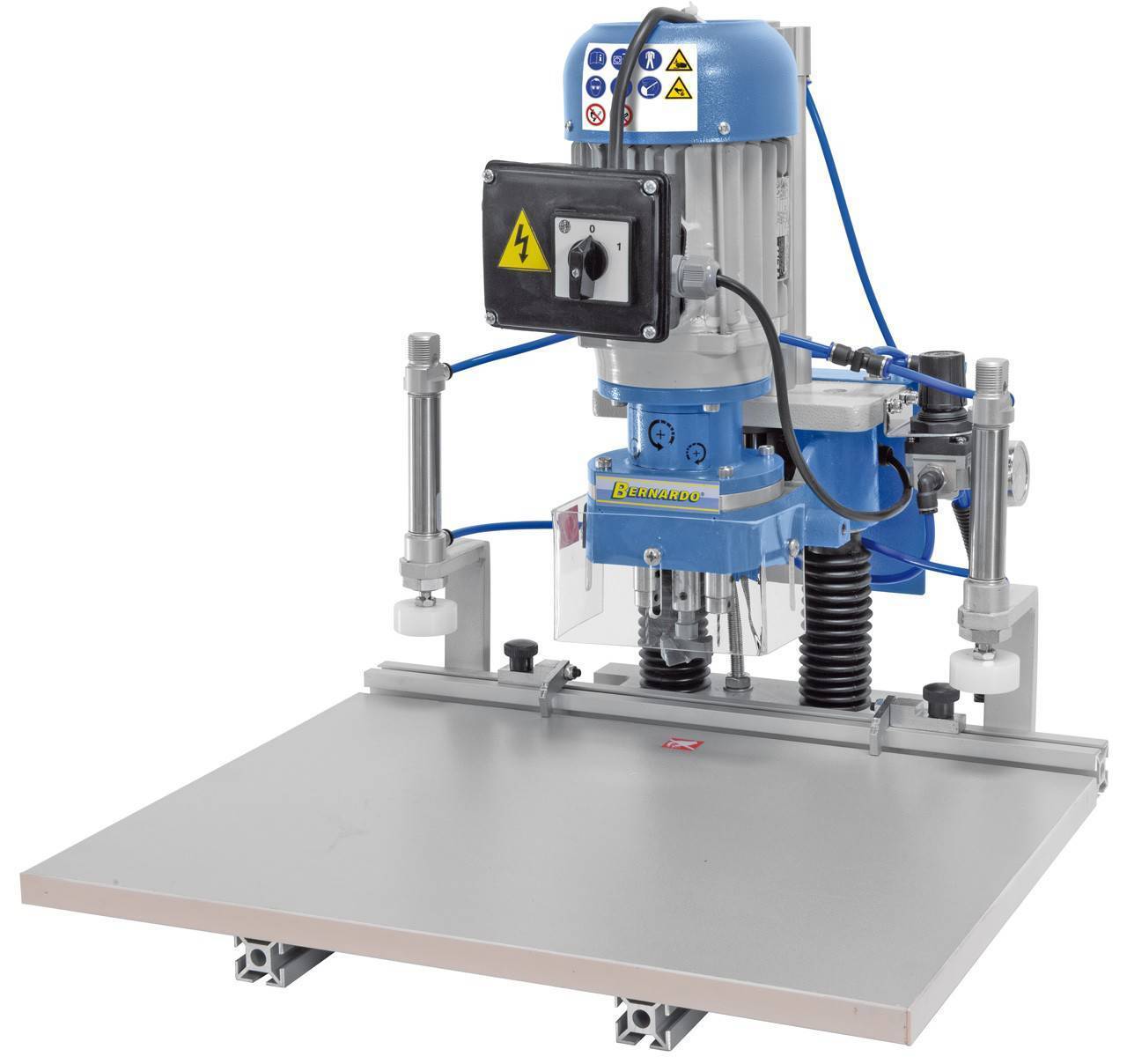 Жесткая конструкция с подвижной фрезерной головкой, способной поворачиваться вокруг вертикальной оси позволяют решать сложные задачи. Обработка взаимно перпендикулярных поверхностей увеличивает темп работ. Электродвигатель мощностью 550 Вт раскручивает шпиндель со скоростью 2200 об/мин. Шесть скоростей, для переключения которых используют перестановку клинового ремня, позволяют обрабатывать любые материалы. Для выбора оптимального режима можно воспользоваться таблицей скоростей.