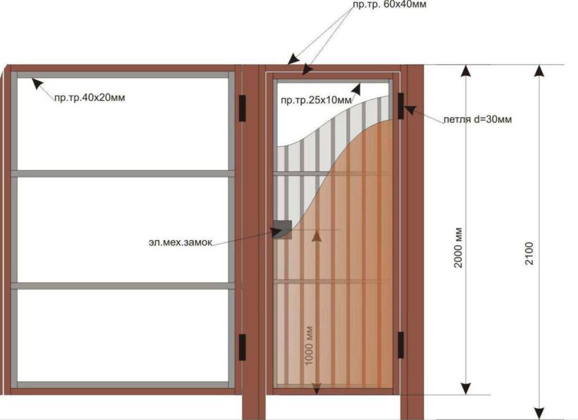 Мы хотим предложить вам несколько готовых чертежей ворот и калиток из профнастила, которые вы сможете подстроить под ваши условия. Высота забора и калитки должна соответствовать высоте забора.