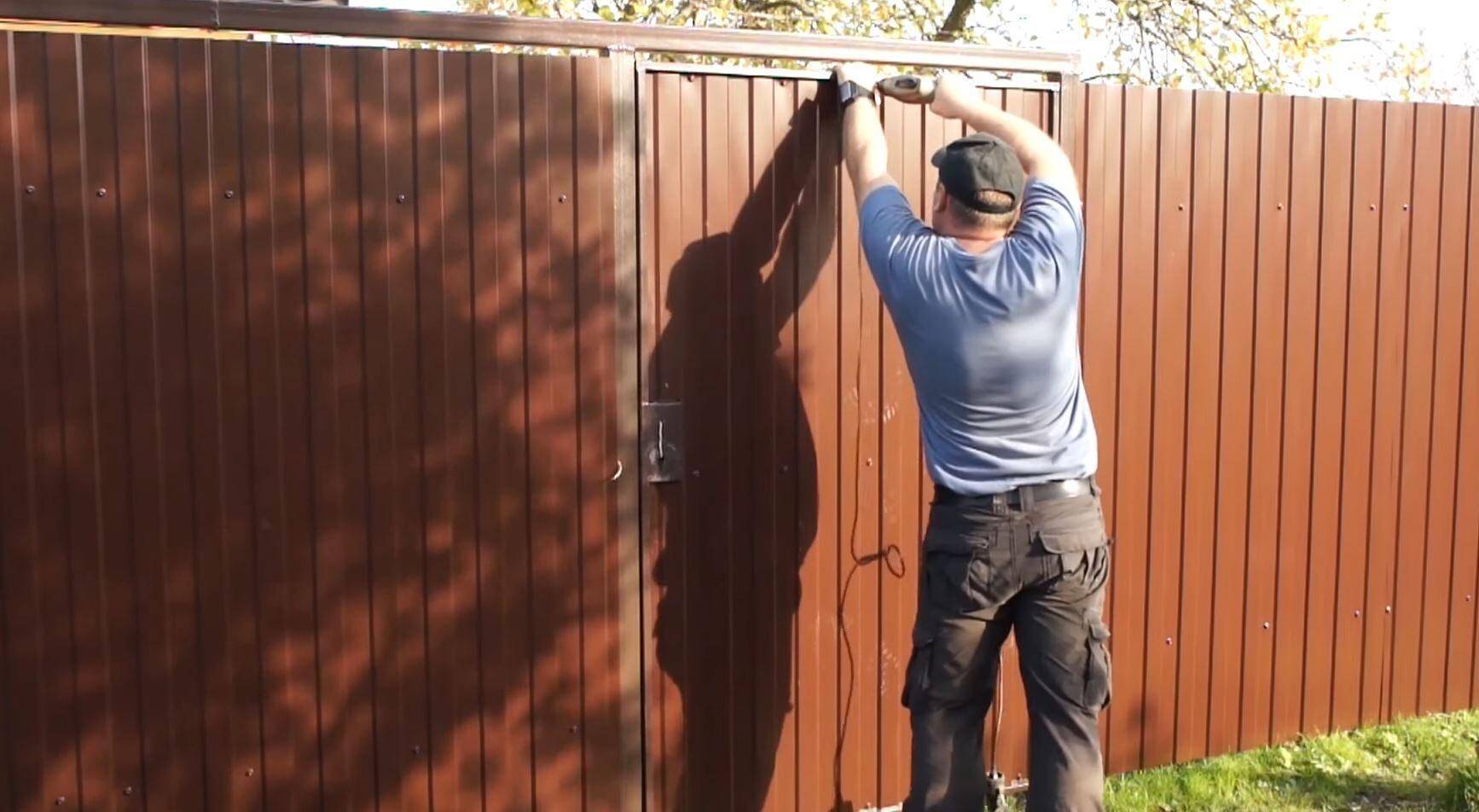- Прикручивают профнастил на каркас и подвешивают калитку.